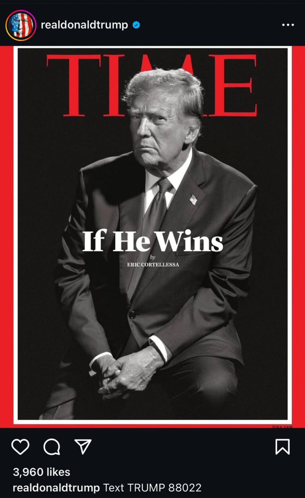 This was not the actual cover but one modified by Trump’s team. By the afternoon, the actual Time Magazine cover was up on IG instead of the modified version. Plus, all of Trump’s team updated their social media pages to the actual Time Magazine image.